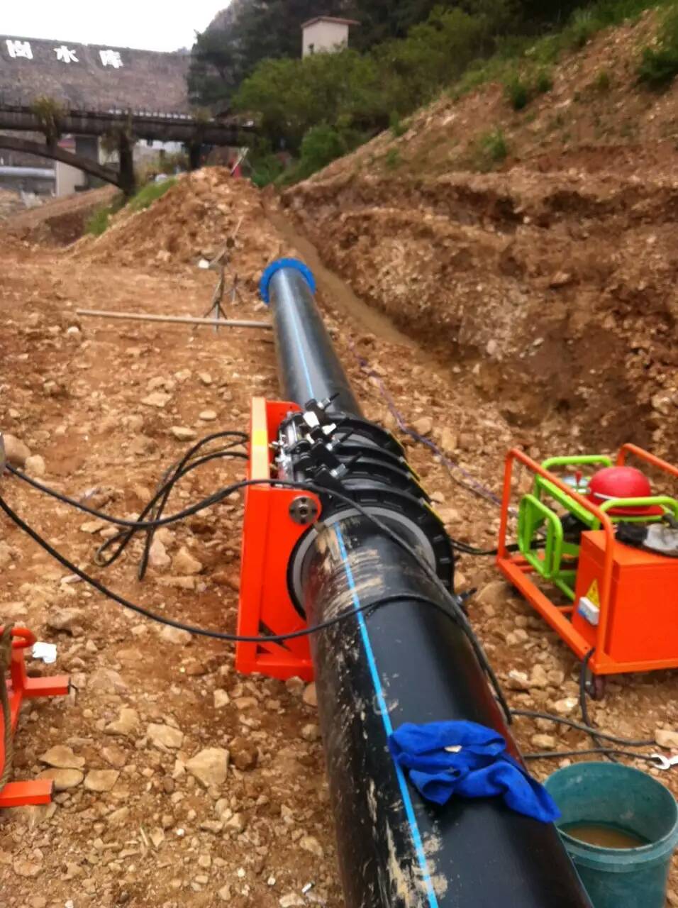 下管。将管材沿沟槽排好,管材下槽前作最后的检查,如有破损或裂纹的则剔除。直径在200毫米以下的管材的移动与下槽,一般不用机械。大直径的管道用轮胎式起重机 或者三脚架和葫芦吊放。排管常常从闸阀或者配件处开始。管子逐根下槽,并顺序做好接口。